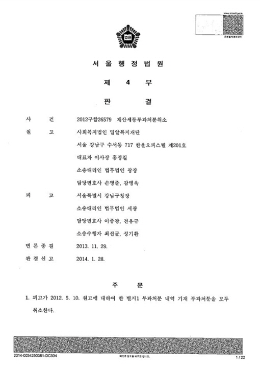 우리재단 밀알아트센터 사업과 관련하여 고유목적사업이 아닌 수익사업으로 보고 재산세를 부과한 조세당국의 처분이 부당하다는 법원 판결이 나왔습니다.