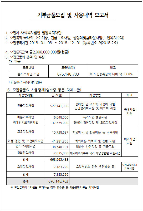 사회복지법인 밀알복지재단은 「기부금품의 모집 및 사용에 관한 법률」에 의거 아래와 같이 기부금품을 모집하여,