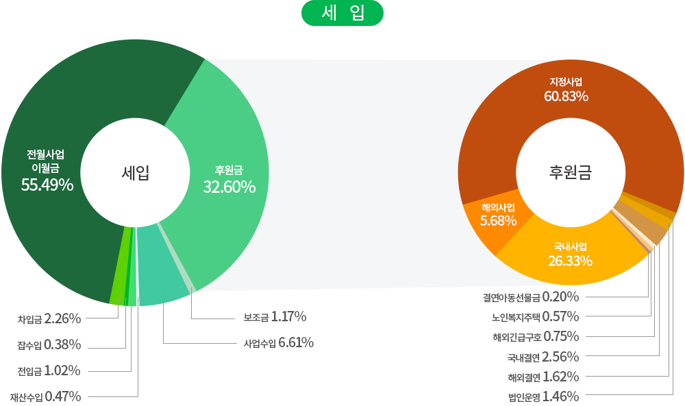 | 사업비 | 국내사업 | 국내아동결연 및 보육, 장애인의료 및 교육지원, 저소득가정지원, 다문화가족지원, 노인복지사업, 지역사회복지사업, 인식개선사업, 발달장애인주간활동서비스 |