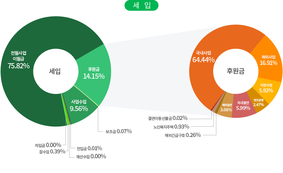 | 사업비 | 국내사업 | 국내아동결연 및 보육, 장애인의료 및 교육지원, 저소득가정 지원, 다문화가족 지원, 노인복지 사업, 지역사회복지 사업, 인식개선 사업, 발달장애인 작가양성지원 사업, 발달장애인 주간활동 서비스, 장애인인식개선센터, 헬렌켈러지원센터 |