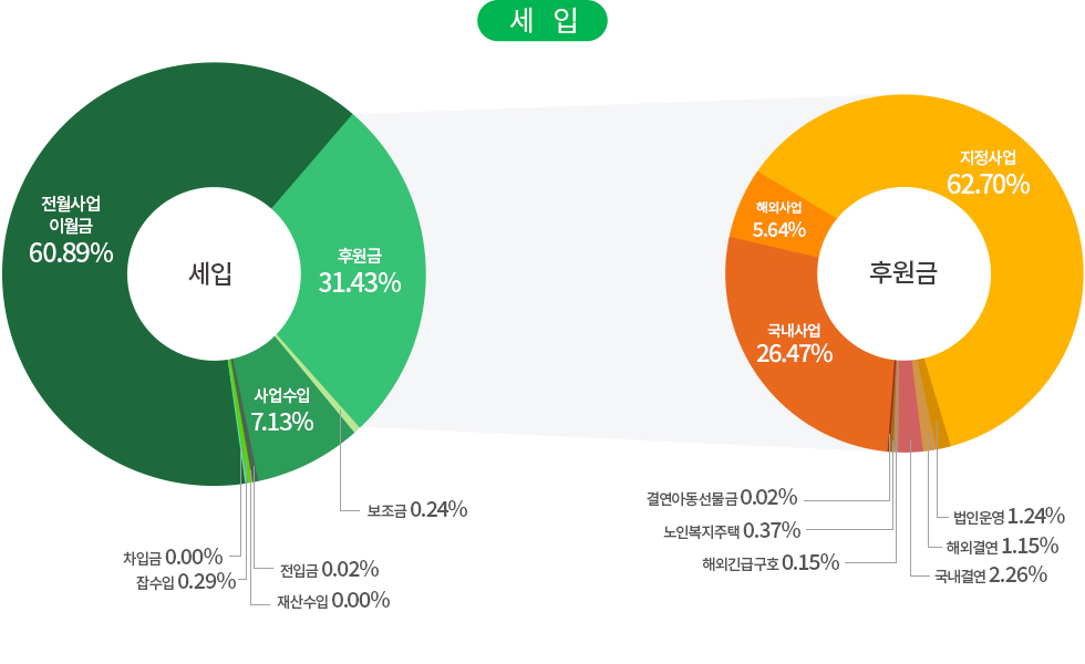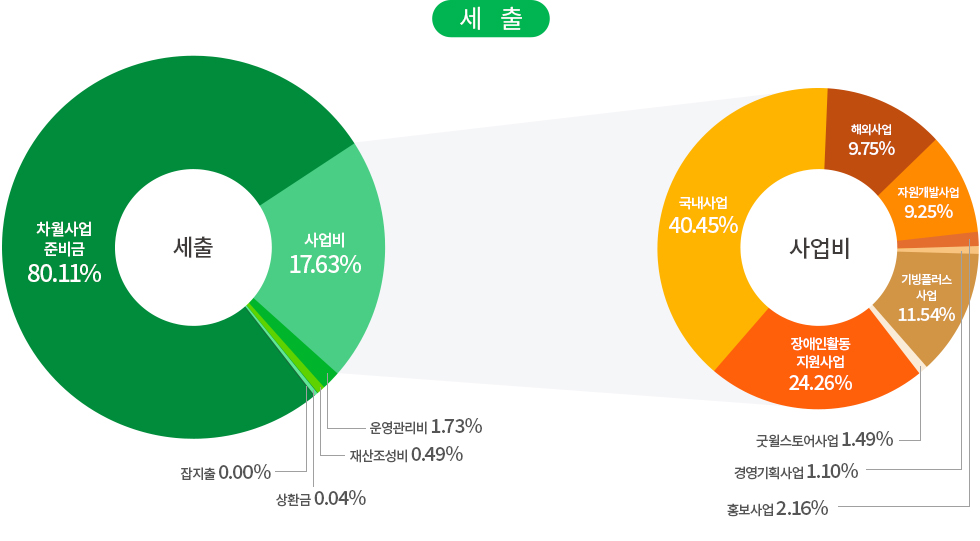 | 사업비 | 국내사업 | 국내아동결연 및 보육, 장애인의료 및 교육지원, 저소득가정 지원, 다문화가족 지원, 노인복지 사업, 지역사회복지 사업, 인식개선 사업, 발달장애인 작가양성지원 사업, 발달장애인 주간활동 서비스, 장애인인식개선센터, 헬렌켈러지원센터 |