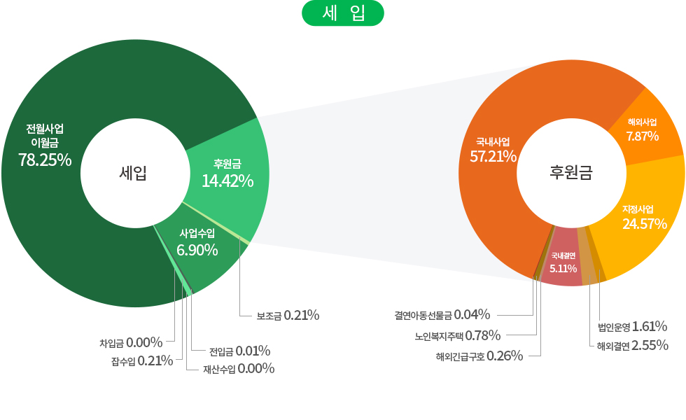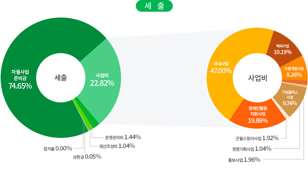 | 사업비 | 국내사업 | 국내아동결연 및 보육, 장애인의료 및 교육지원, 저소득가정 지원, 다문화가족 지원, 노인복지 사업, 지역사회복지 사업, 인식개선 사업, 발달장애인 작가양성지원 사업, 발달장애인 주간활동 서비스, 장애인인식개선센터, 헬렌켈러지원센터 |