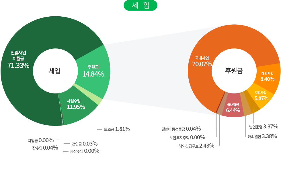 | 사업비 | 국내사업 | 국내아동결연 및 보육, 장애인의료 및 교육지원, 저소득가정 지원, 다문화가족 지원, 노인복지 사업, 지역사회복지 사업, 인식개선 사업, 발달장애인 작가양성지원 사업, 발달장애인 주간활동 서비스, 장애인인식개선센터, 헬렌켈러지원센터 |