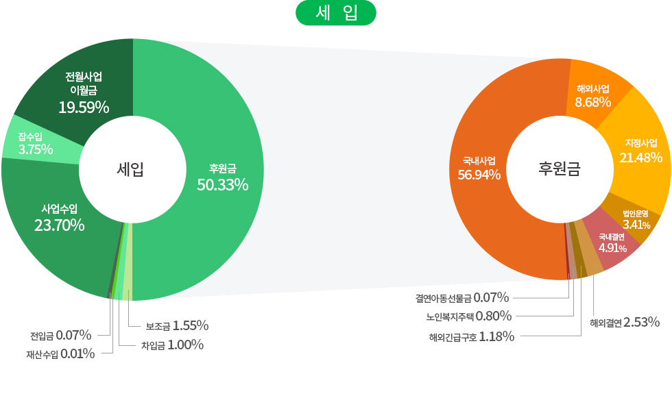 | 사업비 | 국내사업 | 국내아동결연 및 보육, 장애인의료 및 교육지원, 저소득가정지원, 다문화가족지원, 노인복지사업, 지역사회복지사업, 인식개선사업, 발달장애인작가양성지원사업, 발달장애인주간활동서비스, 장애인인식개선센터, 헬렌켈러지원센터 |
