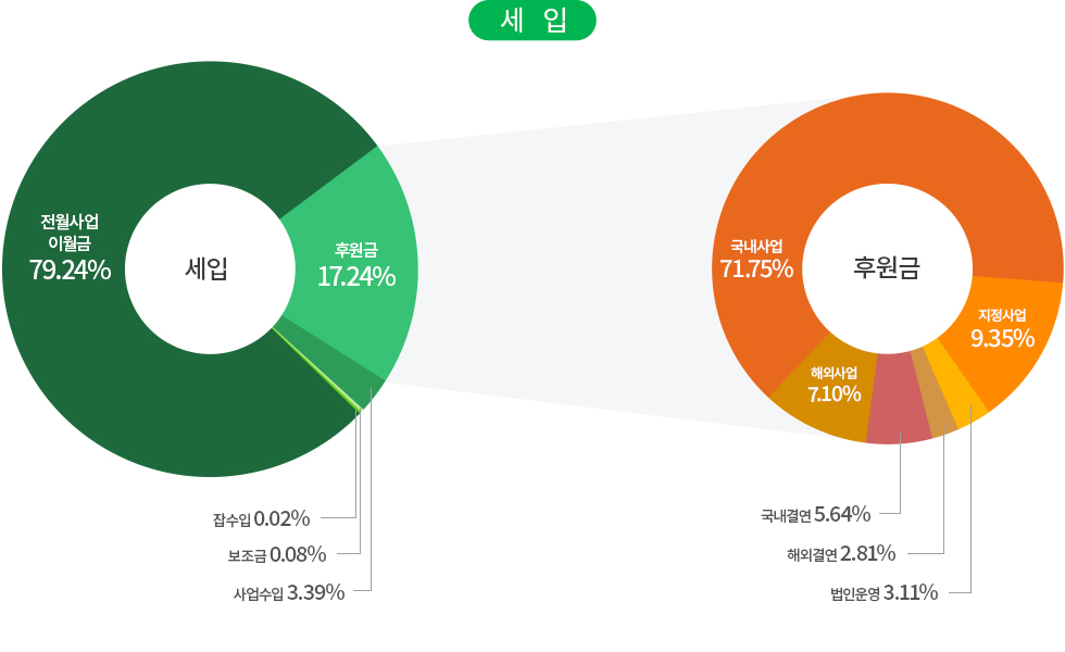 | 사업비 | 국내사업 | 국내아동결연 및 보육, 장애인의료 및 교육지원, 저소득가정 지원, 다문화가족 지원, 노인복지사업, 지역사회복지사업, 인식개선사업, 발달장애인작가양성지원사업, 발달장애인주간활동서비스, 장애인인식개선센터, 헬렌켈러지원센터 |