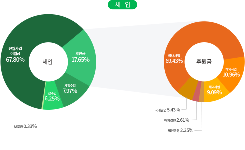 | 사업비 | 국내사업 | 국내아동결연 및 보육, 장애인의료 및 교육지원, 저소득가정 지원, 다문화가족 지원, 노인복지사업, 지역사회복지사업, 인식개선사업, 발달장애인작가양성지원사업, 발달장애인주간활동서비스, 장애인인식개선센터, 헬렌켈러지원센터 |