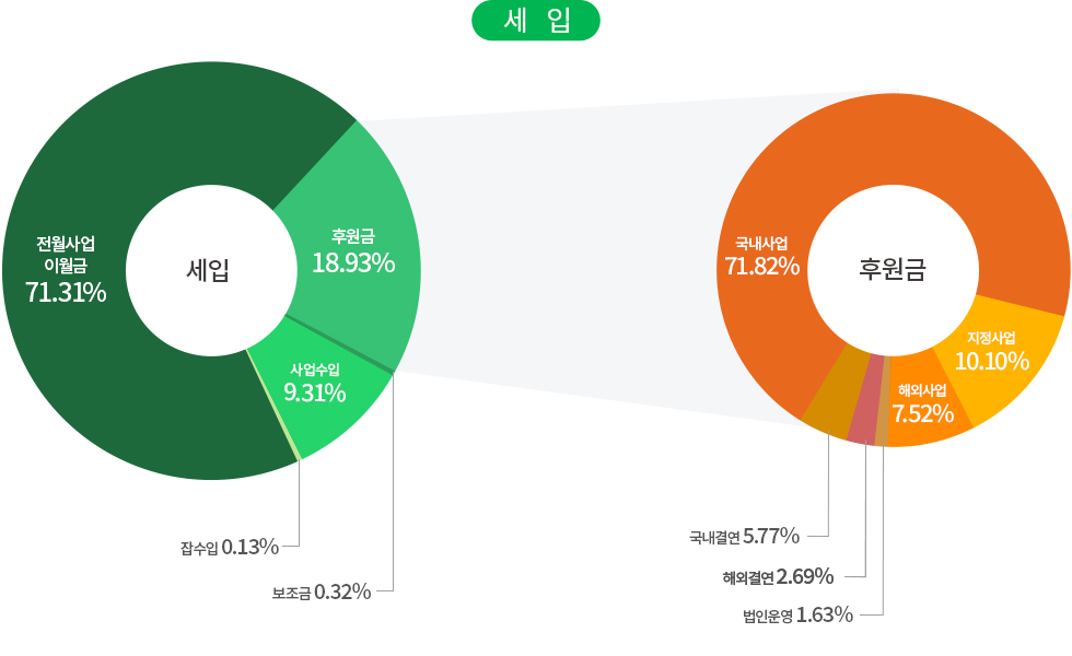 | 사업비 | 국내사업 | 국내아동결연 및 보육, 장애인의료 및 교육지원, 저소득가정 지원, 다문화가족 지원, 노인복지사업, 지역사회복지사업, 인식개선사업, 발달장애인작가양성지원사업, 발달장애인주간활동서비스, 장애인인식개선센터, 헬렌켈러지원센터 |