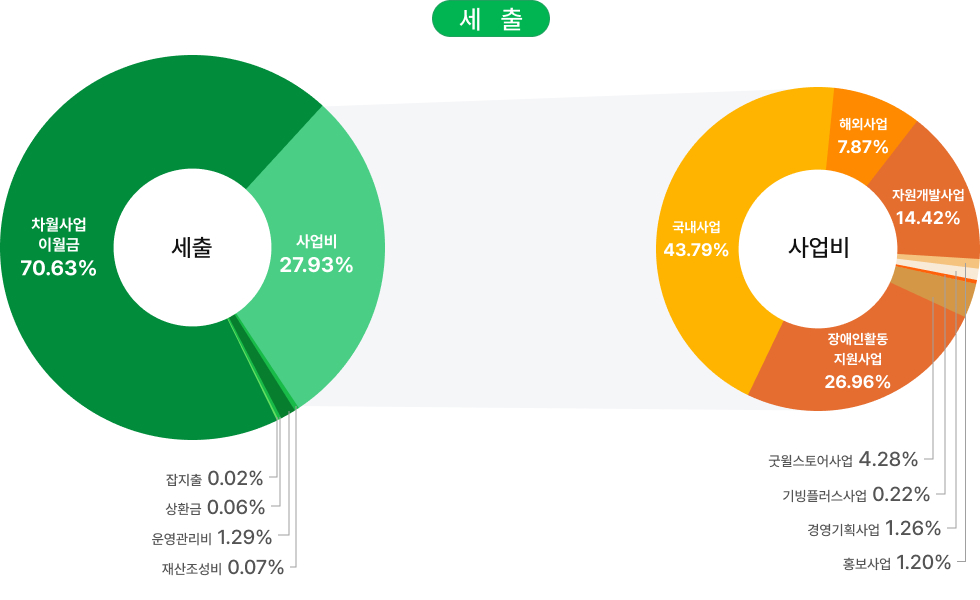 | 사업비 | 국내사업 | 국내아동결연 및 보육, 장애인의료 및 교육지원, 저소득가정 지원, 다문화가족 지원, 노인복지사업, 지역사회복지사업, 인식개선사업, 발달장애인작가양성지원사업, 발달장애인주간활동서비스, 장애인인식개선센터, 헬렌켈러지원센터 |