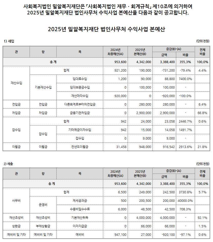 2025년 밀알복지재단 법인사무처 수익사업 본예산 공고
