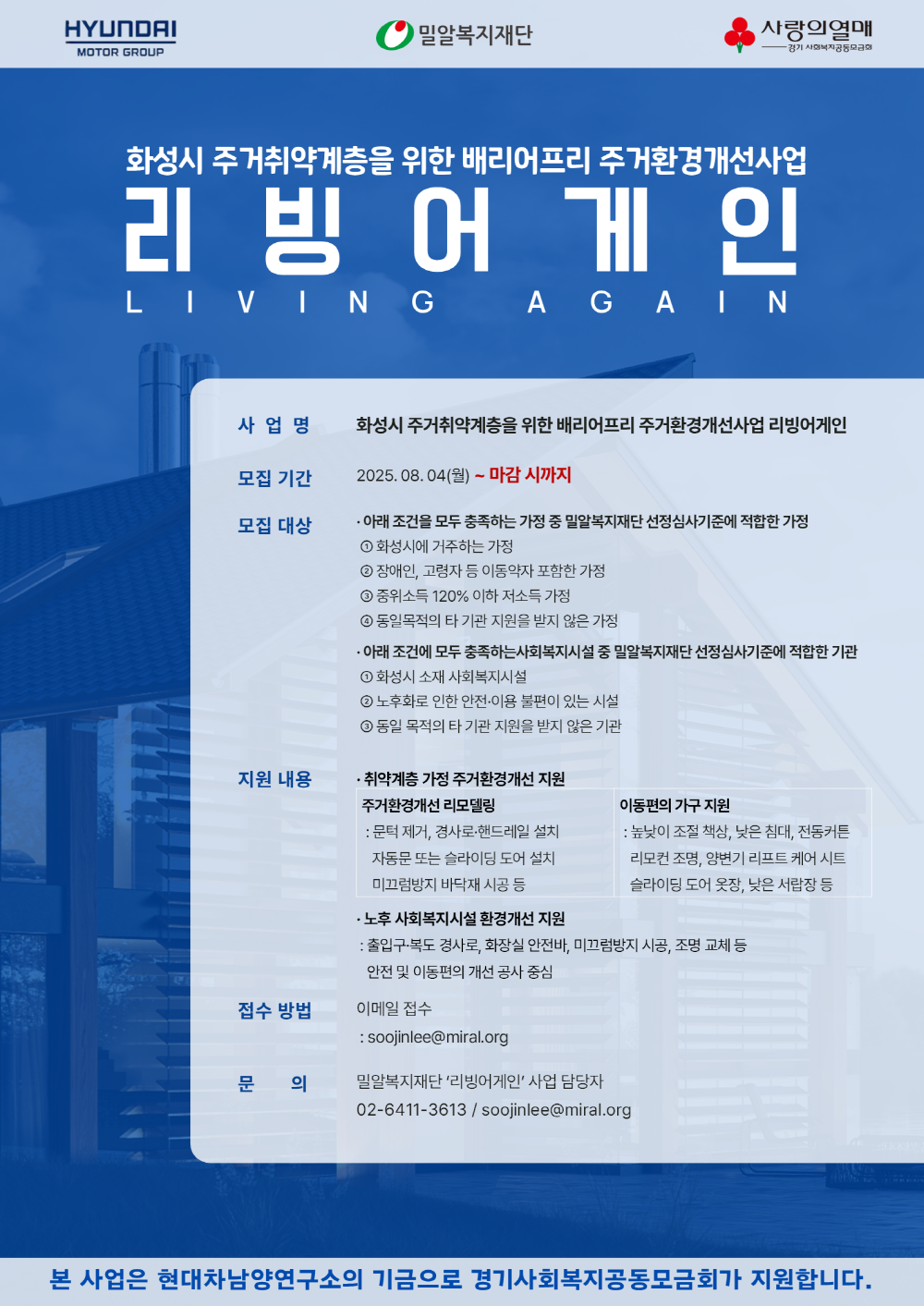 [모집] 현대차남양연구소 화성시 취약계층가정 주거환경개선사업 '리빙어게인' 모집(~마감 시)
