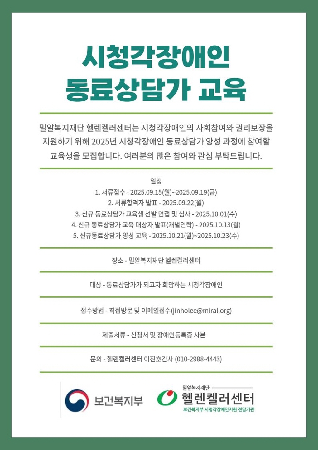 [마감] 헬렌켈러센터 신규 시청각장애인 동료상담가 양성교육생 모집(~9.19)