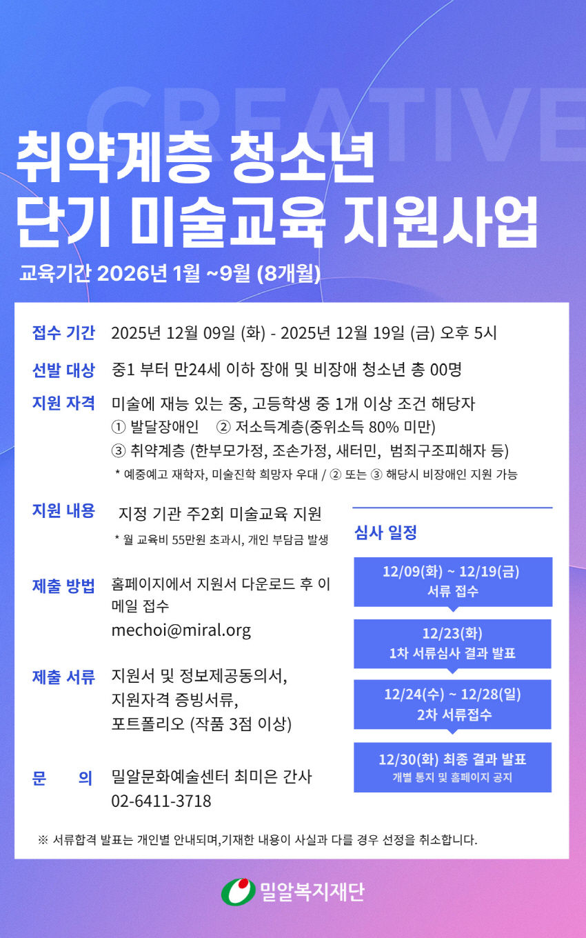 취약계층 청소년 단기 미술교육지원 프로그램 교육생 모집 (~12/19)