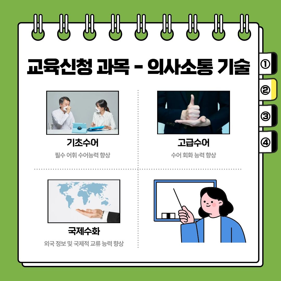 1. 의사소통기술: 점자, 촉수화, 고급수어, 국제수화, 문해, 어휘풀이