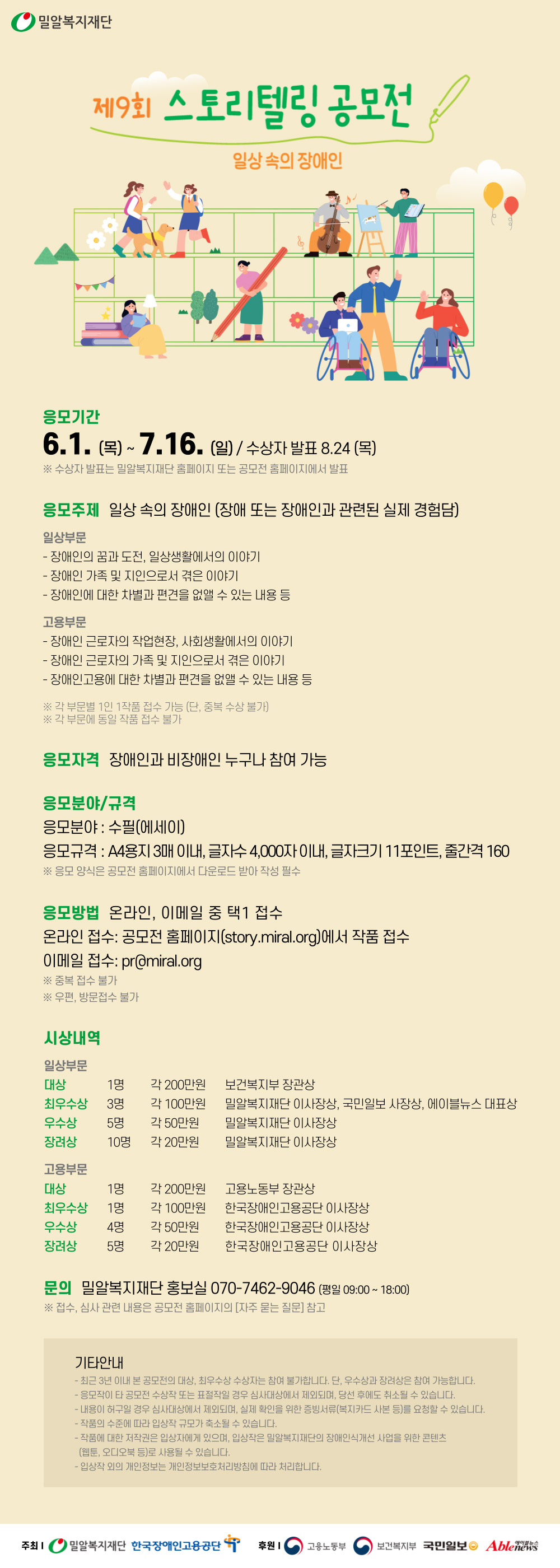 5) 작품에 대한 저작권은 입상자에게 있으며, 입상작은 밀알복지재단의 장애인식개선 사업을 위한 콘텐츠(웹툰, 오디오북 등)로 사용될 수 있습니다.