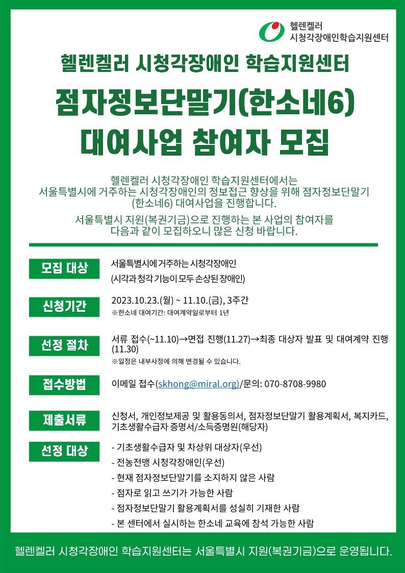 헬렌켈러 시청각장애인 학습지원센터에서는 서울특별시에 거주하는 시청각장애인의 정보접근 향상을 위해 점자정보단말기(한소네6) 대여사업을 진행합니다. 서울특별시 지원(복권기금)으로 진행하는 본 사업의 참여자를 다음과 같이 모집하오니 많은 신청 바랍니다.