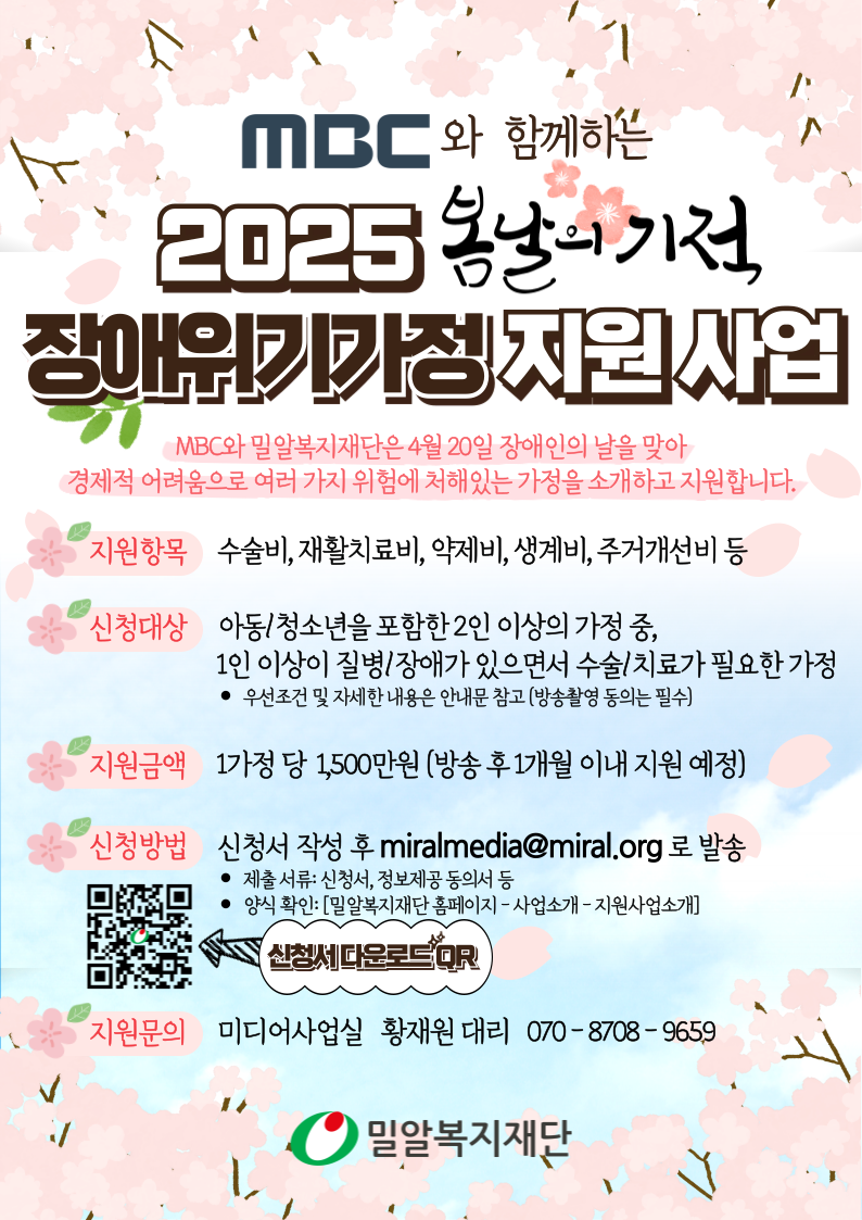 접수 방법 | ① 본 게시글 첨부파일 확인 및 다운로드 ② “MBC봄날의기적(신청자명)”으로 제목 통일 ③ 접수 이메일(miralmedia@miral.org)로 발송 |
