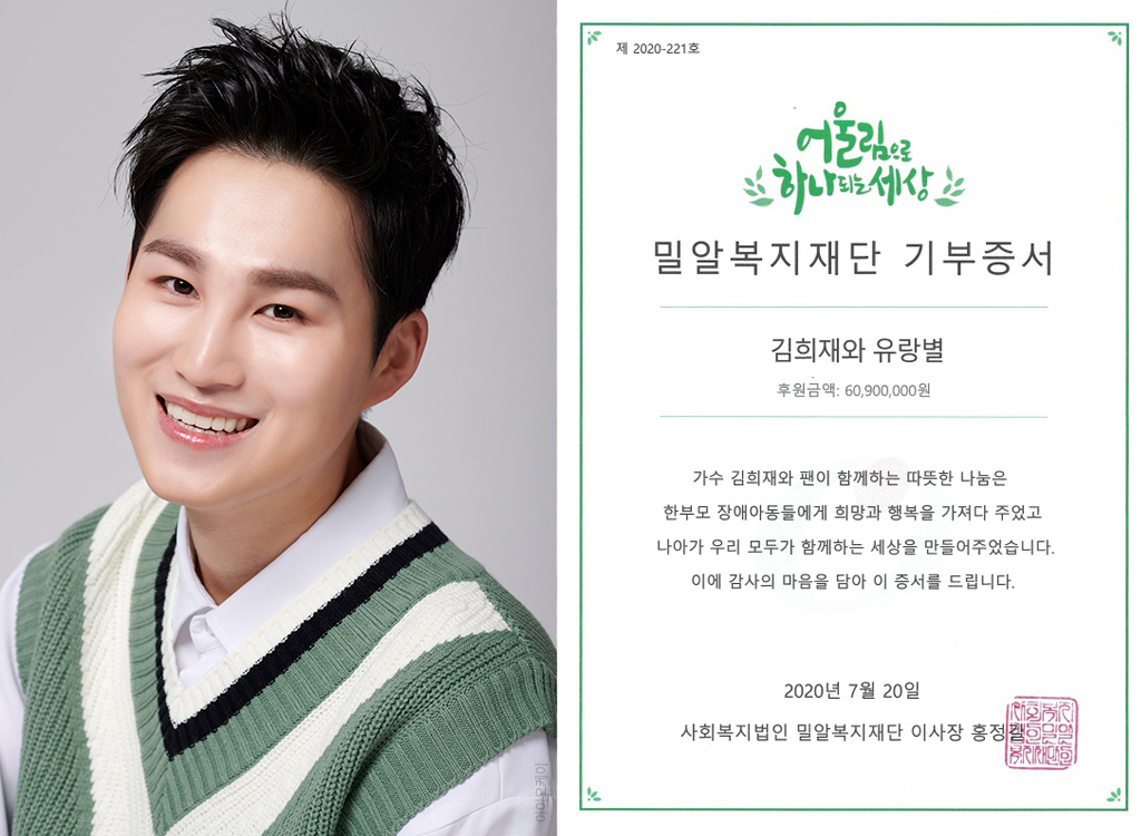 가수 김희재(좌) (사진 = 소속사 제공)/ '김희재와 희랑별' 기부증서(우)