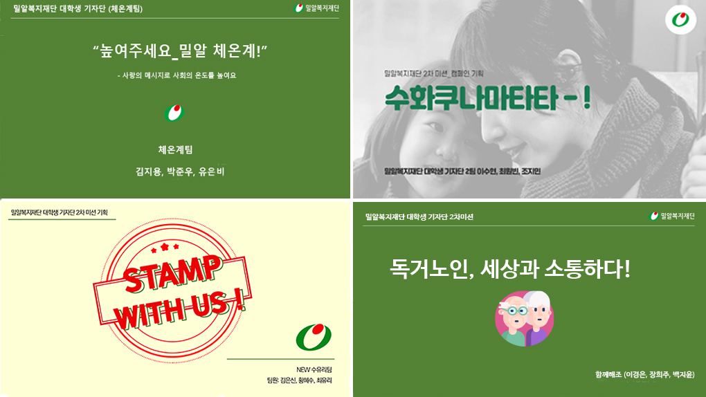 2차 미션은 바로 ‘더 나은 세상을 위한 캠페인 아이디어 제안’이었습니다. 특히 인상 깊었던 아이디어는 기존 밀알복지재단의 SNS 콘텐츠인 ‘수어톡톡’을 활용해 마스크 착용으로 청각장애인이 겪는 소통의 어려움을 주제로 한 ‘수화쿠나마타타’였습니다. 입모양에 따라 의미가 달라지는 수화를 통해 일반마스크와 립뷰(lip-view) 마스크의 차이를 비교하는 내용의 ‘수화쿠나마타타’ 캠페인 등 2기 밀알 대학생기자단이 제안한 톡톡 튀는 캠페인 아이디어는 참신성, 현실성, 논리성 등을 검토해 재단에서 활용할 예정입니다.