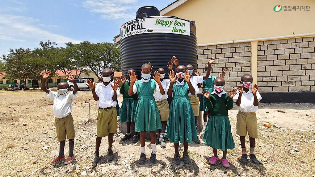 이번 3월 22일은 세계 물의 날이라는 걸 알고 계셨나요? 1992년 UN에서는 물 부족의 경각심을 일깨우고자 매년 3월 22일을 ‘세계 물의 날’로 지정했습니다. 이를 기념하여 코로나19 상황 속 밀알복지재단 케냐 사업장을 소개해드리려고 하는데요. 코로나19로 케냐 전역에 내려진 휴교령이 지난 1월, 약 1년 만에 해제되면서 아이들이 다시 학교 등교를 하게 되었습니다. 하지만 대부분의 학교가 코로나19 방역지침을 준수할 여건이 되지 못해 밀알복지재단은 코로나19로부터 아이들의 안전한 학습 환경 조성을 위한 총 6개 학교 내 물탱크를 설치하여 깨끗한 물 공급을 지원했습니다.