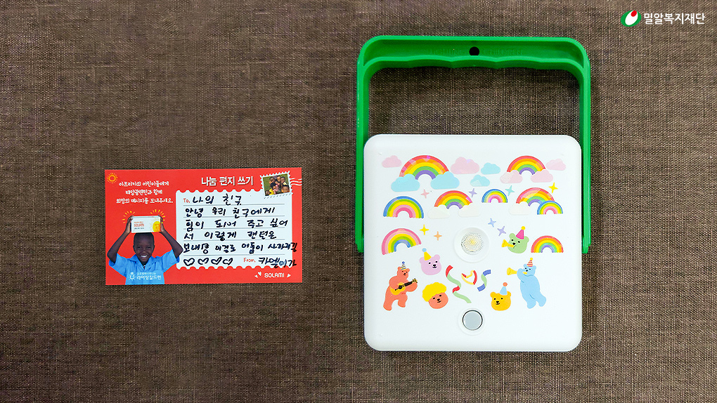 에너지 빈곤국가 아이들에게 소중한 빛을 선물해준 미래소년. 그 선한 영향력이 팬들과 수많은 사람들에게 전해져 더 많은 아이들이 빛을 잃지 않고 건강하게 살아갔으면 좋겠습니다. 앞으로도 밀알복지재단 라이팅칠드런 캠페인의 태양광랜턴에 많은 관심과 참여 부탁드립니다! 감사합니다.