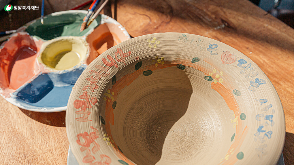 도자기 그릇을 일정 시간 동안 햇빛에 말린 후, 그릇에 그림을 그려보는 시간을 가졌습니다. 시청각장애인들은 활동지원사의 안내에 따라 알록달록한 물감으로 천천히 그림도 그리고, 글씨도 적어보았습니다.