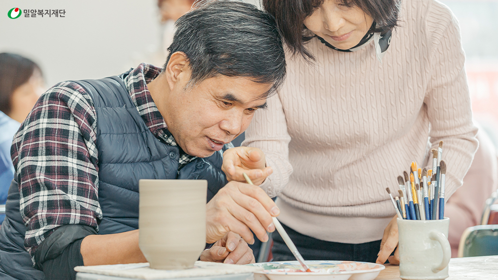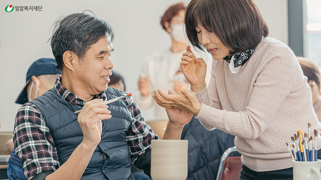 도자기 그릇에 그림을 그리고 있는 시청각장애인과 활동지원사