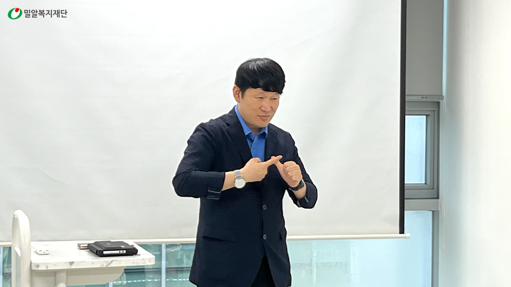 먼저 시청각장애인에 대한 일반적인 정의와 유형, 욕구, 의사소통 등을 알아보기 위해 밀알복지재단 홍유미 헬렌켈러센터 센터장의 강의가 시작되었습니다. 이어서 손창환 시청각장애인 동료상담사의 ‘시청각장애인의 삶’, 김용재 시청각장애인 동료상담사의 ‘점자 배우는 과정’을 통해 시청각장애인의 실제 사례를 소개하는 시간을 가졌습니다.