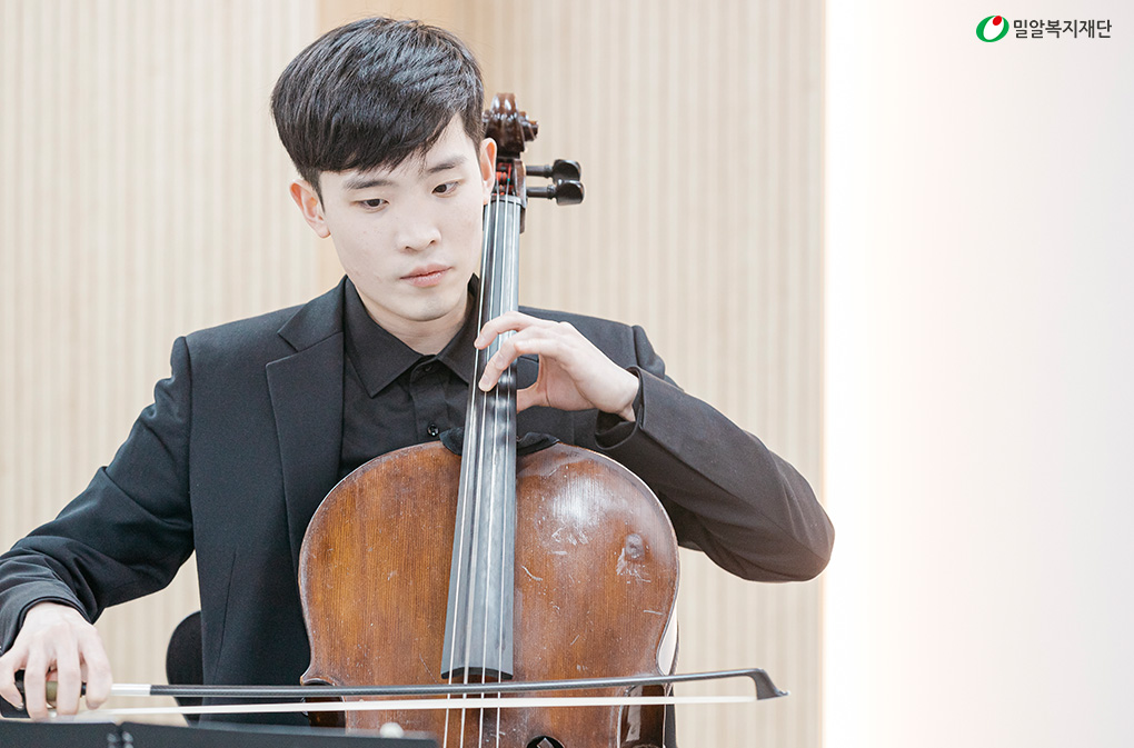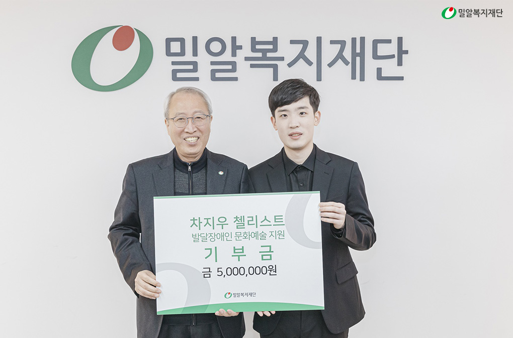 밀알첼로앙상블 ‘날개’에서 10년 간 수석단원으로 활동했던 첼리스트 차지우 군을 기억하시나요? 차지우 군은 지난해 날개 수석단원으로서의 활동을 종료하고, 현재는 음악대학원에서 석사 과정을 밟는 동시에 전문 연주자로 활약하고 있는데요. 지난 3월 4일, 차지우 군이 밀알복지재단에 금의환향 했습니다. 후배 발달장애 예술인 양성을 위해 500만 원을 기부하러 밀알복지재단에 방문한 겁니다.