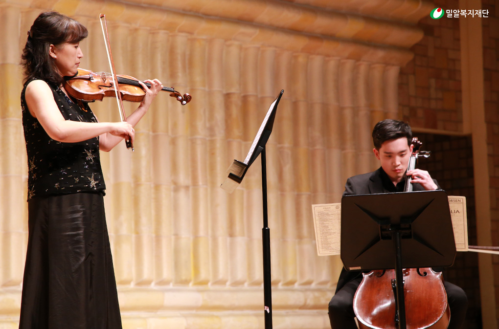(왼쪽부터) 밀알복지재단 정형석 상임대표, 첼리스트 차지우 군