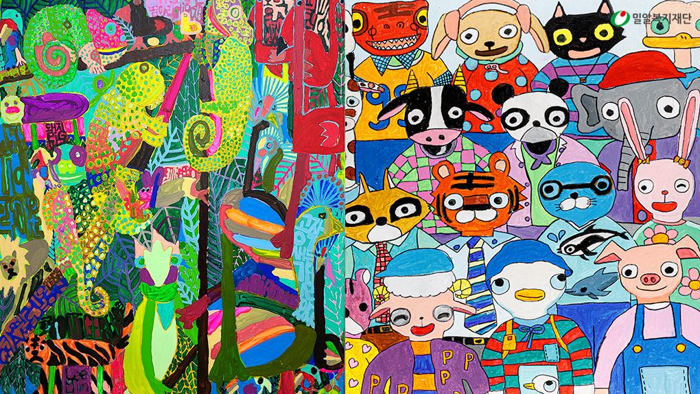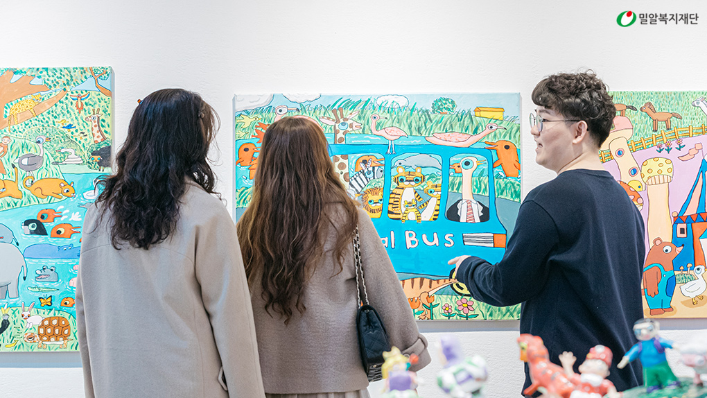 그다음으로는 아프리카 동물들의 재미있는 표정을 보여주는 현승진 작가의 그림이 있었습니다. 고향의 그리움을 건물만으로 그려냈던 윤인성 작가의 회화 속에는 사람이 등장하기 시작하며 스토리의 풍성함을 더했습니다. 사람들의 시선을 한 몸에 받은 ‘티티와 미미’를 그린 김지우 작가는 최근 고양이 그림이 SRT 캐릭터 공모전에 당선되고, 장학금을 받는 등 미술작가로서 무한한 가능성을 보이고 있습니다. 역동적인 사람을 그리는 전민재 작가는 작년 11월 밀알복지재단을 통해 DS투자증권에 미술작가로 취업하였고, 교육지원을 함께 받고 있습니다.