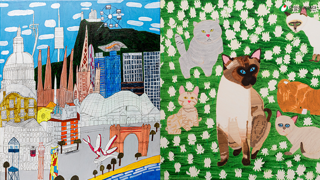 (좌)김지우 작가 '꽃벤치에 휴식하는 티티와 미미', (우)전민재 작가 '제주도 산책'