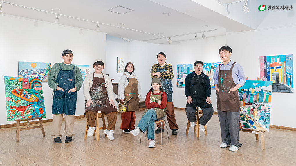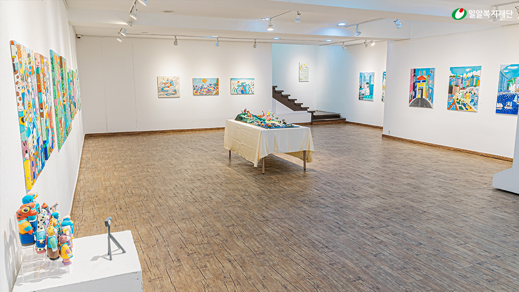 밀알문화예술센터 소속 브릿지온 아르떼는 ‘장애인과 비장애인을 미술작품으로 연결하겠다.’는 장애인식개선을 목적으로 전시를 개최하고 있습니다. 특별히 이번 전시회에는 ‘Bridge4Us 함께하는 우리’라는 제목처럼 브릿지온 아르떼 작가 네 명뿐만 아니라 3월부터 채용된 김기정, 김지우, 이민서 작가와 DS투자증권 소속 전민재 작가가 초대작가로 참여하였습니다. 그렇게 총 여덟 작가의 작품 47점이 걸려 전시의 다양성을 한층 더하였습니다.