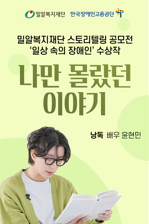 독서의 계절이자 마음까지 상쾌해지는 가을, 제10회 스토리텔링 공모전 수상작들이 오디오북 「나만 몰랐던 이야기 7」로 여러분을 찾아갑니다. 「나만 몰랐던 이야기」는 지금까지 정소민, 조병규, 김지은, 김인권, 박시은, 진태현 등의 배우들과 여러 성우가 낭독자로 참여했습니다. 그들의 나눔에 이어 이번에는 배우 윤현민이 오디오북 녹음에 함께했습니다. 그는 스토리에 깊이 공감하며 특유의 감미로운 목소리로 수상작의 감동을 더욱 여운 있게 전해주었습니다.