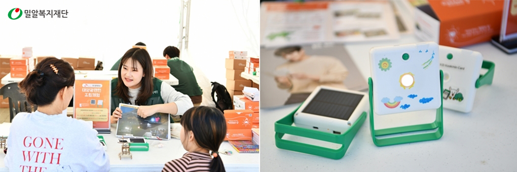 이 밖에도 직접 만든 태양광랜턴을 에너지 빈곤국가에 보낼 수 있는 ‘태양광랜턴 조립체험’, 빛이 없는 삶을 체험해 볼 수 있는 ‘어둠 체험’, 밀알복지재단이 말라위에 설립한 에너지자립마을에서 태양광 발전 설비로 직접 만든 다양한 물품을 만나보고, 아프리카에 대한 정보도 얻을 수 있는 ‘아프리카 말라위 전시관’등 즐겁게 에너지 나눔에 동참할 수 있는 프로그램들이 시민들의 큰 호응을 얻었습니다. 친환경 에너지를 활용한 프로그램도 주목을 받았는데요. '바다유리 키링 만들기', '양말목 그립톡 만들기', '페트병 새활용 화분 만들기','태양광 헬리콥터 만들기' 등의 부스는 많은 어린이들의 참여가 이어졌습니다. 자녀들과 함께 축제 현장의 모든 프로그램을 체험하고 돌아간다는 한 시민은 ‘아이들이 에너지의 소중함을 알게 된 시간이 된 거 같아 뜻깊다’며 ‘내년에도 축제가 열린다면 꼭 참석하고 싶다’고 전했습니다.