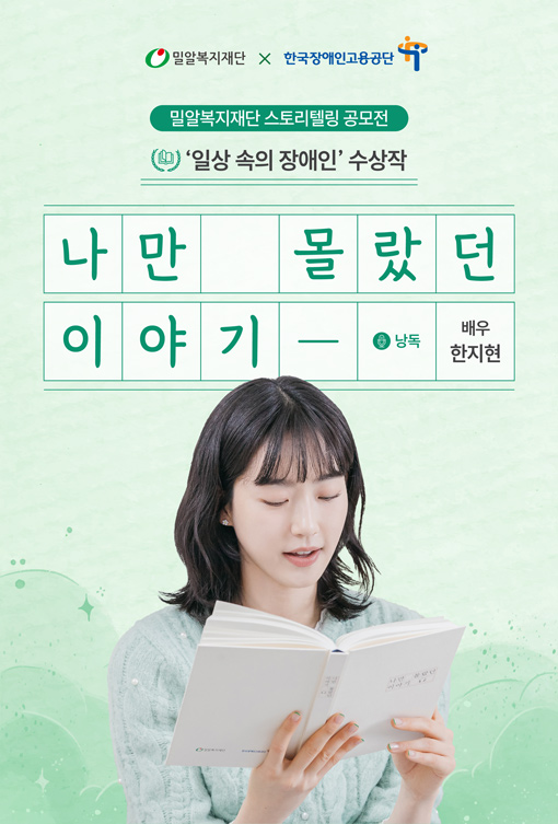2025년 새해 시작을 따사롭게 만들어줄, 오디오북 「나만 몰랐던 이야기 9」가 여러분의 곁으로 찾아갑니다. 「나만 몰랐던 이야기」는 밀알복지재단과 한국장애인고용공단이 함께하는 스토리텔링 공모전 수상작으로 제작되며, 공모전에서는 장애인의 일상을 담은 수필을 모집하고 있습니다. 지금까지 정소민, 박시은, 진태현, 윤현민 등의 배우와 아이돌그룹 하이키의 리더 서이가 낭독자로 참여했습니다. 그들의 나눔에 이어 이번에는 뛰어난 연기력과 예능에서 비춘 사랑스러운 캐릭터로 시청자들을 사로잡은 배우 한지현이 오디오북 녹음에 함께했습니다. 배우 한지현은 담담하면서도 깊이 있는 목소리로 낭독하며 일상 속 장애인의 스토리를 더욱 감명 깊게 전해주었습니다.