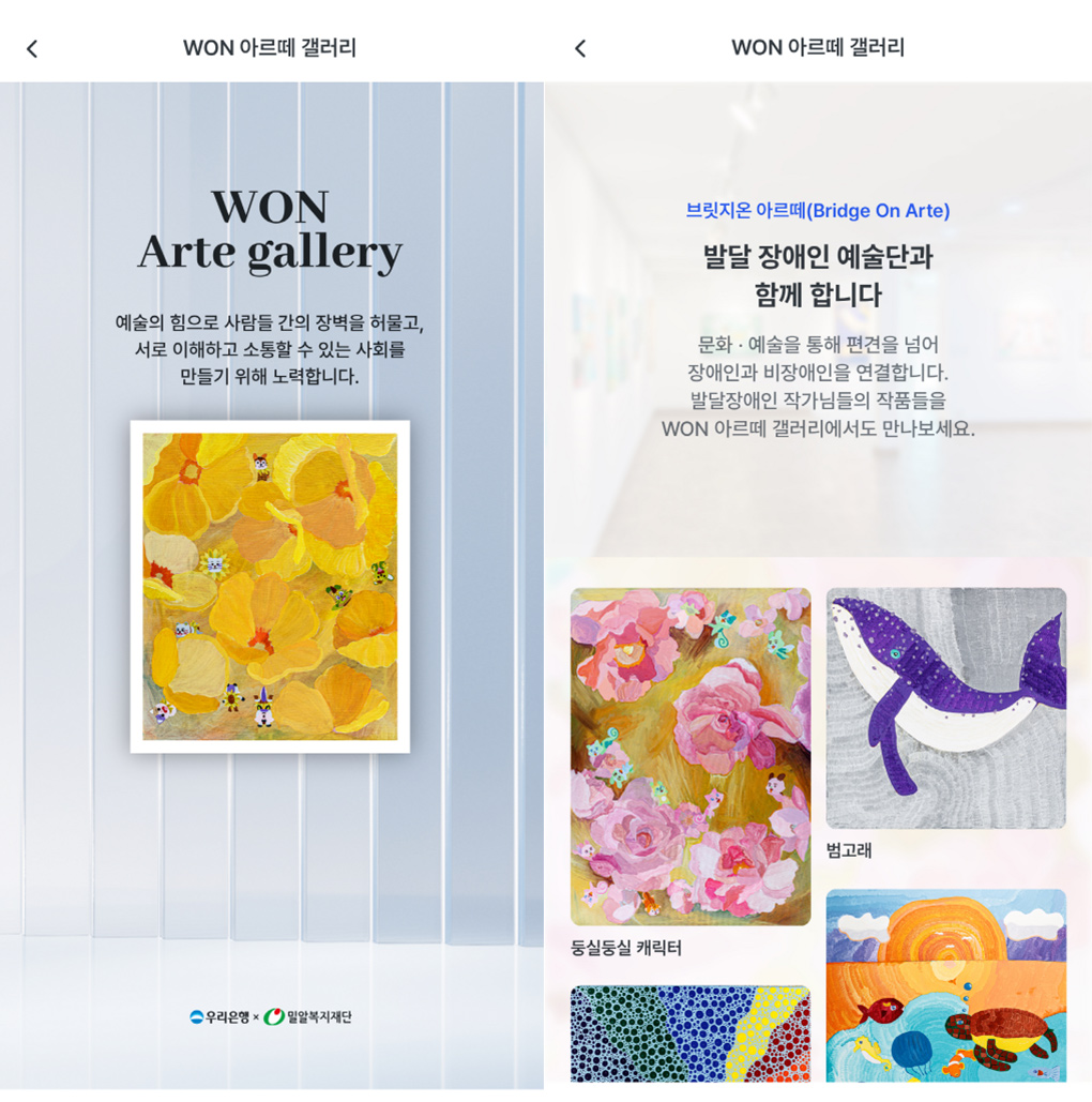 지난해 7월 선보인 WON 아르떼 갤러리는 우리은행 고객을 비롯한 많은 사람들로부터 뜨거운 호응을 얻었습니다. 금융 플랫폼을 넘어, 장애 예술인들의 문화·예술세계를 소개했다는 점에서 의미 있는 시도로 평가받았는데요. 우리은행 관계자는 “장애인도 우리가 함께 살아가는 사회공동체 속에서 충분히 주역이 될 수 있다”며, 올해에도 더 많은 발달장애인 작가들의 작품을 갤러리를 통해 소개하고 있다고 전했습니다.