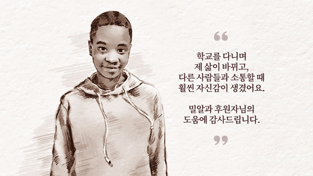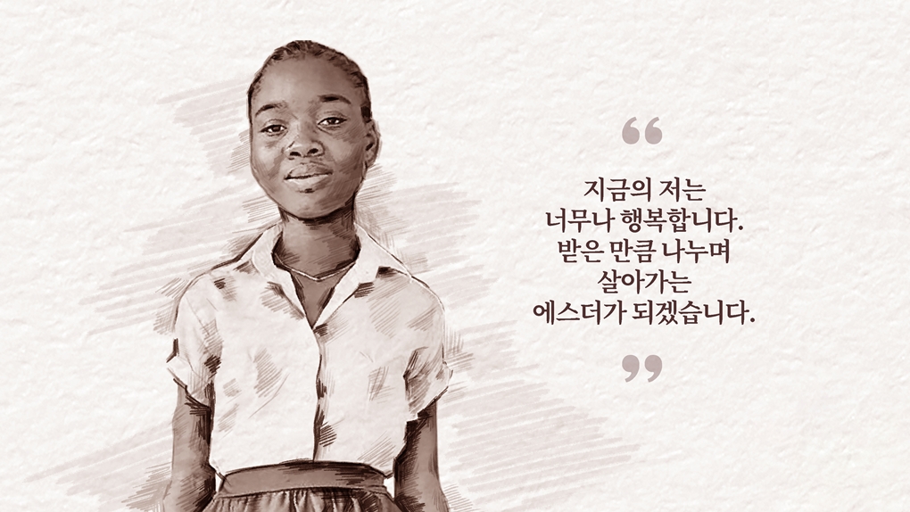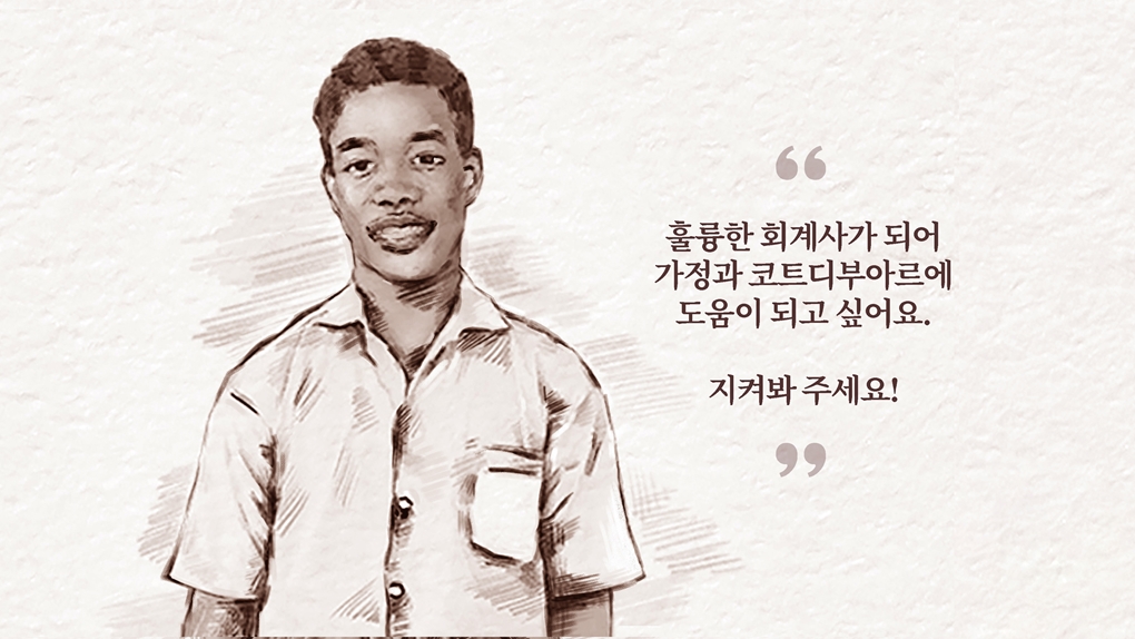 마을 사람들이 다 알 만큼 에스더(가명)의 가정 형편은 열악했습니다. 학업 포기를 결심하기도 수차례, 에스더는 든든한 지지자인 언니와 물심양면 지원해 주시는 후원자님 덕분에 새롭게 시작할 수 있었습니다. 에스더는 지각 한번 하지 않고 매 학기 좋은 성적을 받았으며 선생님들 사이에서도 성실한 아이라는 평이 자자했습니다. 에스더는 노력의 결실로 코트디부아르의 서울대라고 불리는 ‘아비장 대학교’에 입학하게 되었습니다. 에스더는 학업과 아르바이트를 병행하며 바쁘고 고된 성인의 삶을 견뎌내야 하지만, 받은 도움과 마음에 부응해 더욱 나누며 살아가겠다며 또 한 번 성실한 학교생활을 결심합니다.
